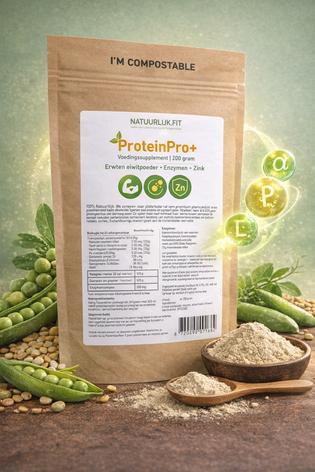 ProteinPro+ van Natuurlijk.fit biedt je een premium plantaardig eiwitpoeder, rijk aan meer dan 80% eiwitten uit biologische erwten. Speciaal verrijkt met het gepatenteerde DigeZyme® enzymcomplex voor een optimale opname en vertering. Dit alles verpakt in een plasticvrije verpakking, een bewuste keuze voor een duurzamere toekomst.